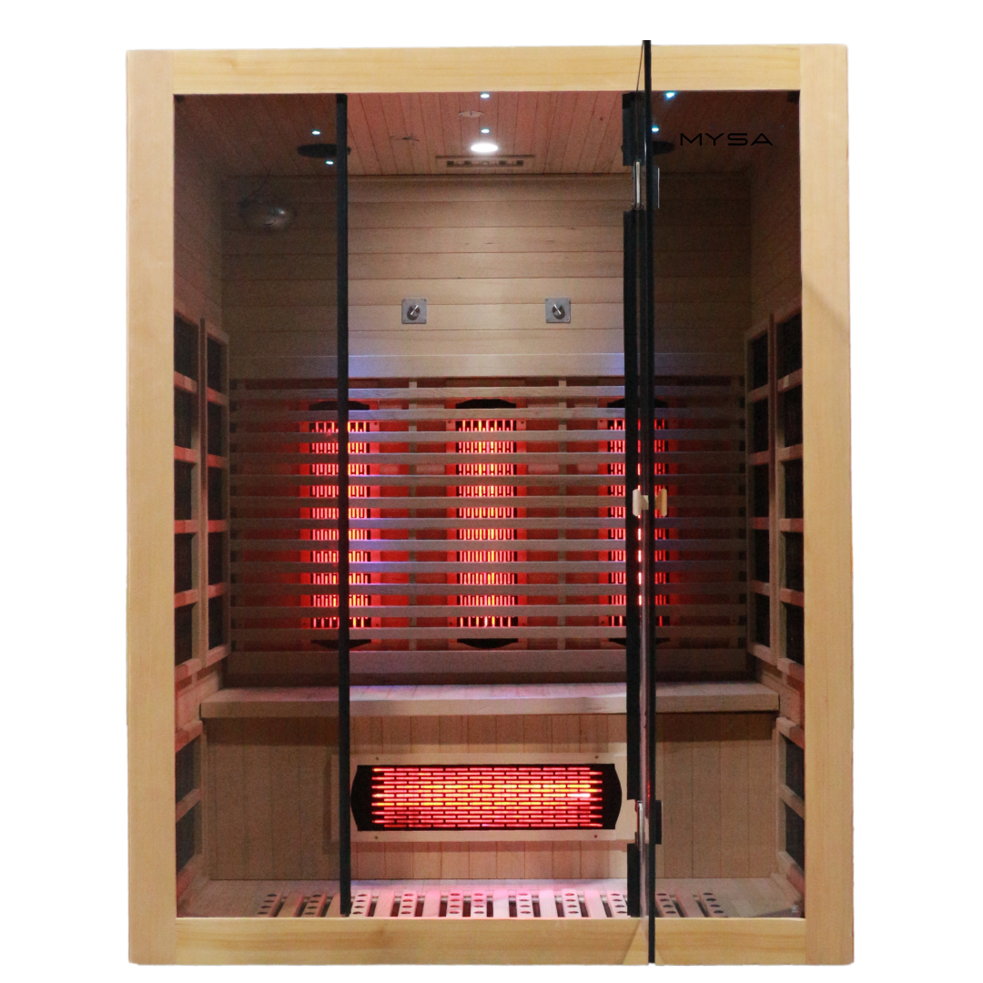 Bring full-spectrum infrared therapy home. The MYSA Mirage 3-Person Sauna combines deep, even heat, low EMF design, and premium Canadian hemlock with tinted glass for daily recovery and relaxation.